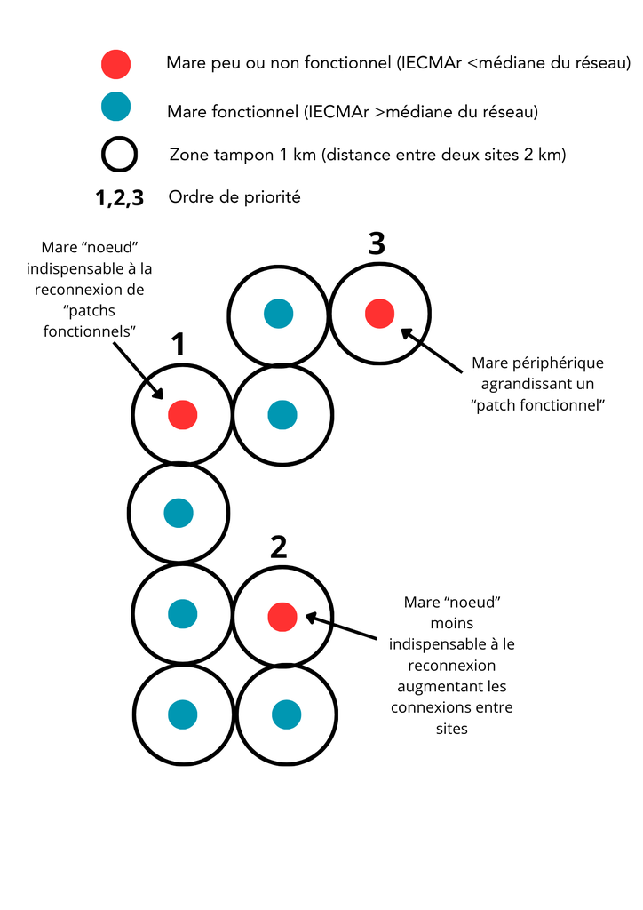 La priorisation et sélection des sites-travaux s’effectuera au sein des « patchs non fonctionnels » avec un objectif de restaurer des mares peu ou non fonctionnelles permettant de relier ou d’agrandir des « patchs fonctionnels » au sein du réseau considéré. L’objectif sera de travailler sur 10 % (pour un effet notable) à 50 % des mares du réseau (pour conserver une diversité de stades d’évolution des mares).
