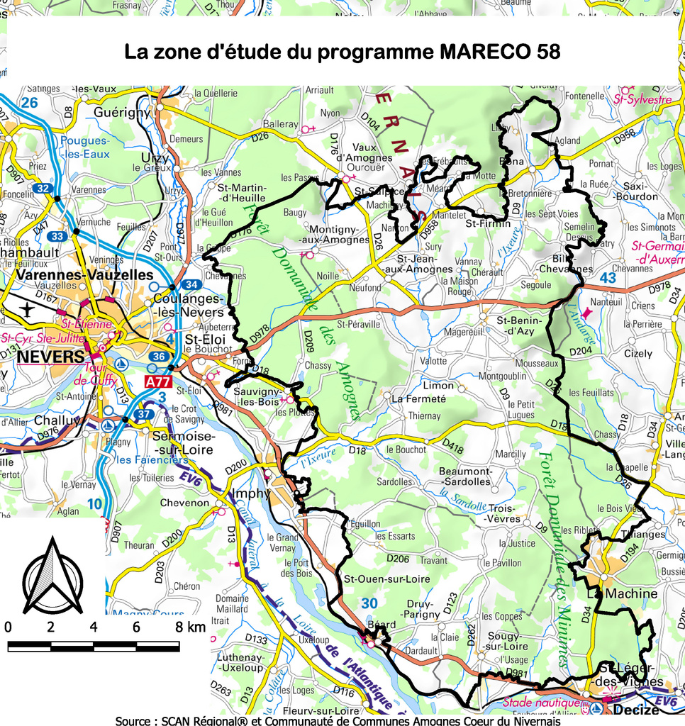 La Fédération Départementale des Chasseurs de la Nièvre agréée au titre de protection de l’environnement continue son travail dans la restauration et la création de mares. Le programme MARECO 58 financé par des subventions publiques (70 % par le Fonds Vert et 30 % par le FEDER) et piloté par le Bureau d’études de la FDC 58 vise à créer ou restaurer 35 à 60 mares d’ici fin 2027. Il se déroule sur le site Natura 2000 « Bocage, forêts et milieux humides des Amognes et du bassin de la Machine » comprenant 28 communes :