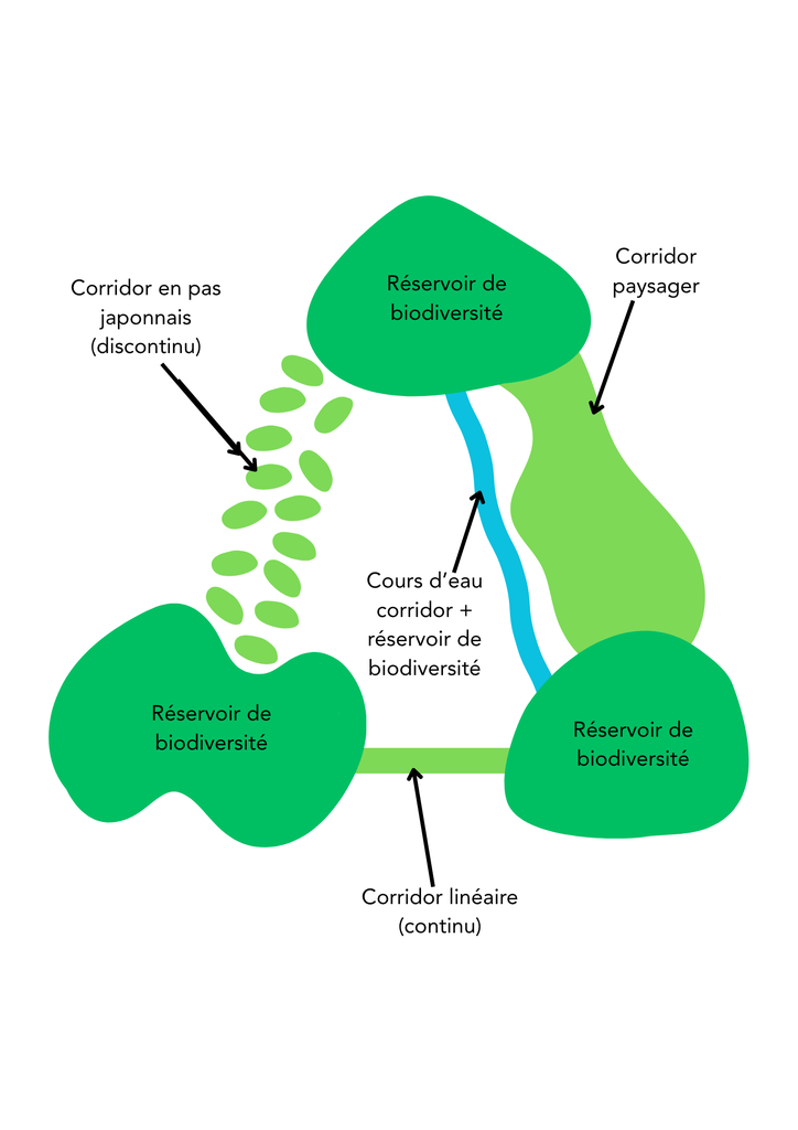 La continuité écologique fait appel à la présence de « corridors écologiques » qui sont des voies de déplacement empruntées par la faune et la flore. Ils leurs permettent de communiquer entre les différents réservoirs de biodiversité et de réaliser leur cycle de vie, favorisant ainsi l’échange génétique. Les corridors écologiques peuvent prendre différentes formes telles que :
